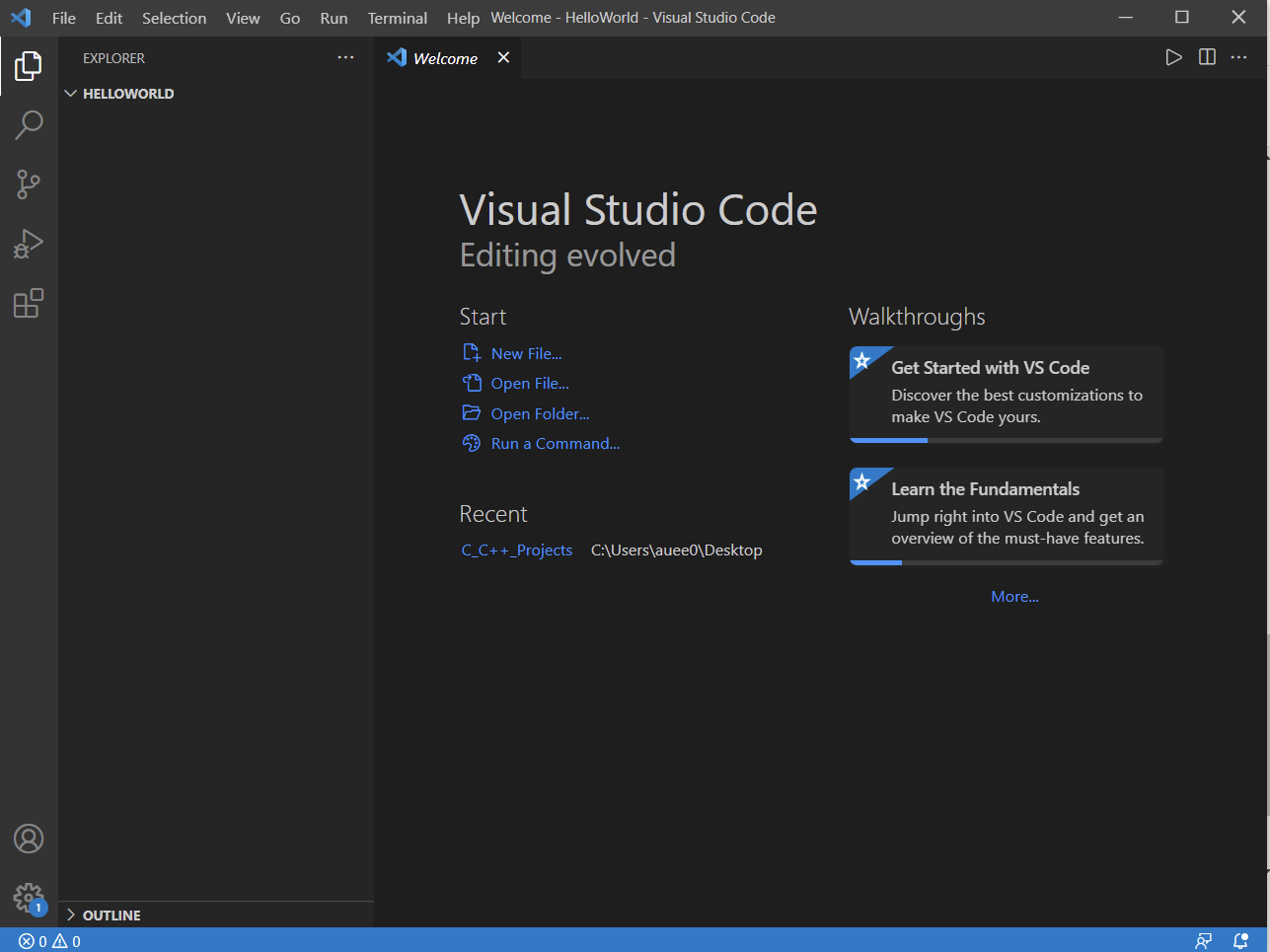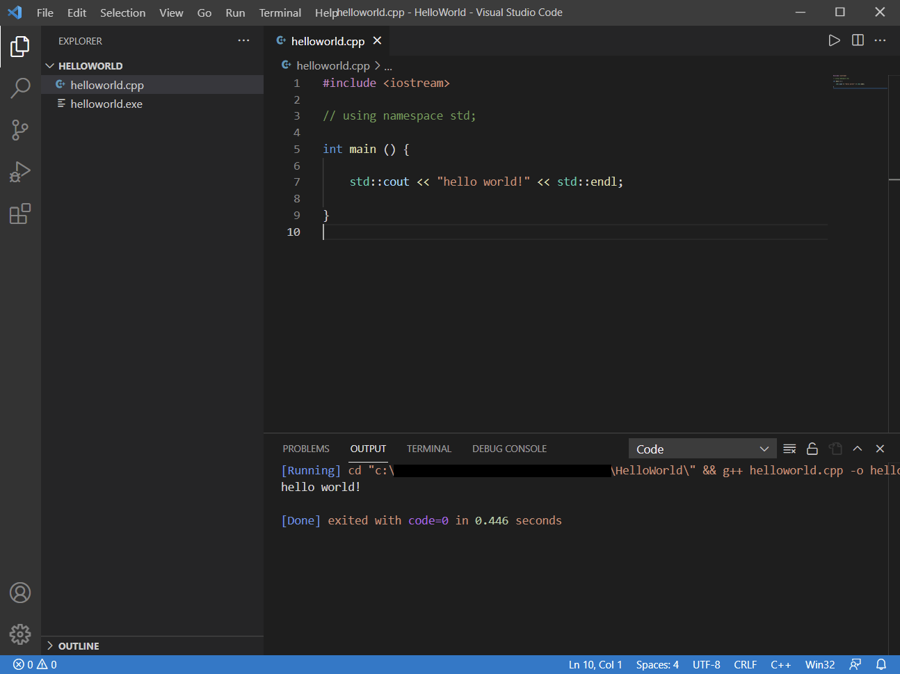 코드를 돌리면 helloworld.exe 실행파일이 생성되고
