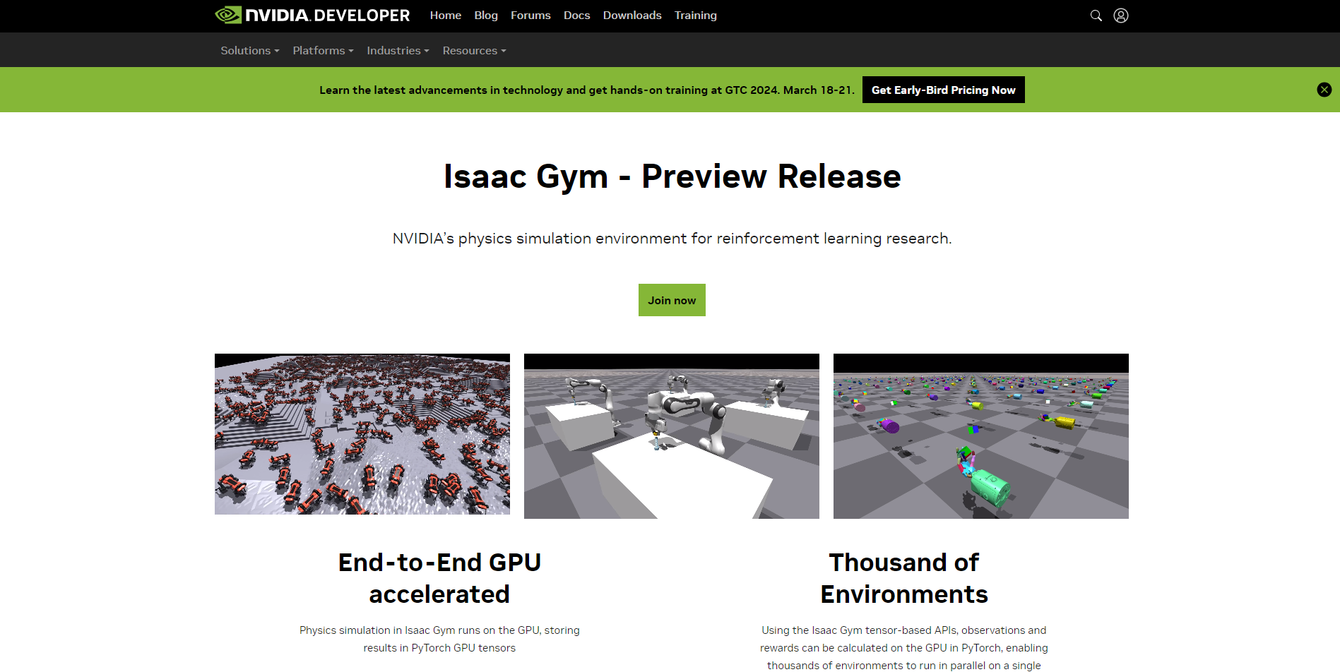 먼저 Isaac Gym을 다운로드하기 위해서는 Nvidia 계정이 필요하다. Nvidia에 가입하여 계정을 생성한 후 Isaac Gym 웹페이지로 들어가서 Join now 버튼을 누른다.