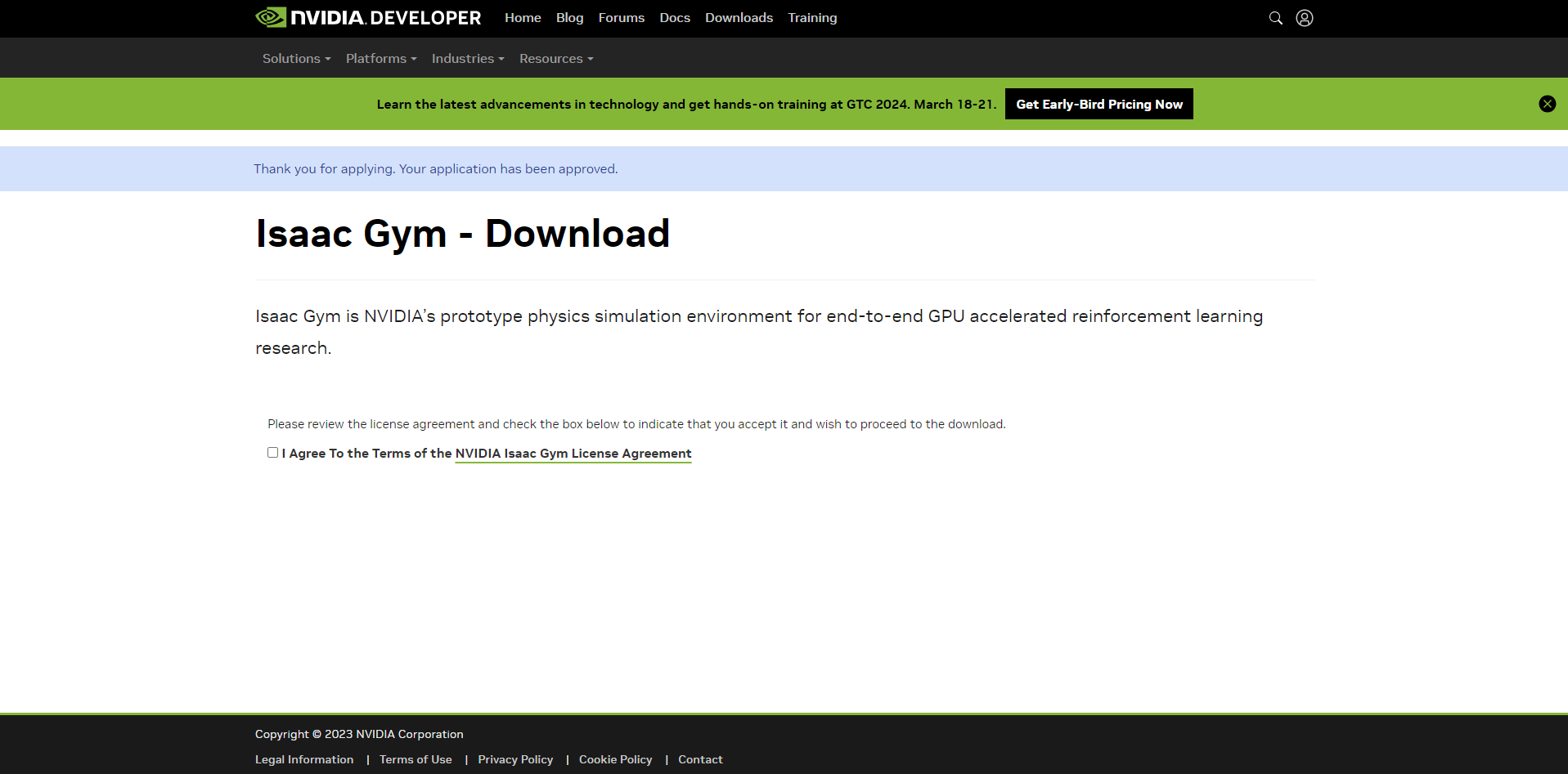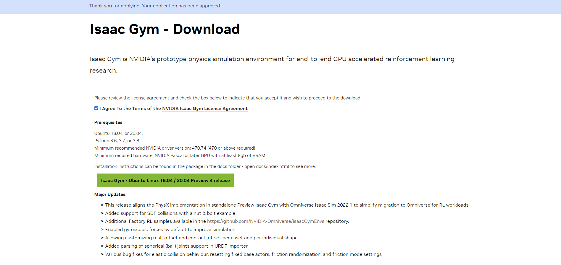 Isaac Gym - Preview Release를 다운받으려면 membership에 참여되어 있어야 한다. 이를 위해 이메일과 소속을 입력한 후 양식을 제출한다. 그러면 신청이 승인되었다는 배너와 함께 Isaac Gym을 다운로드 할 수 있는 페이지가 뜬다.