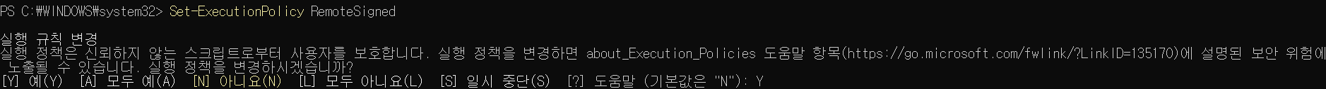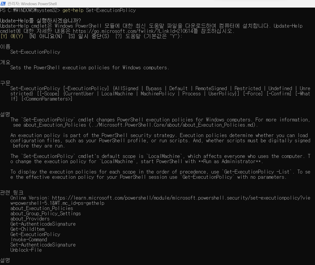 PowerShell 프롬프트에 get-help Set-ExecutionPolicy를 입력하면 "Update-help를 실행하시겠습니까?" 라는 물음과 선택 옵션이 뜨는데, 이미 예("Y")가 기본값이므로 Enter 키를 누른다.
