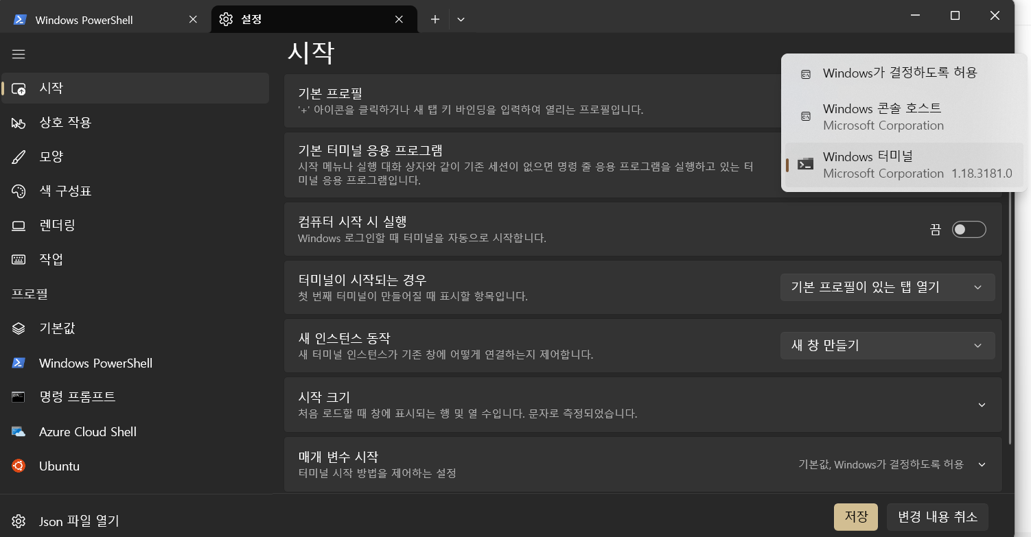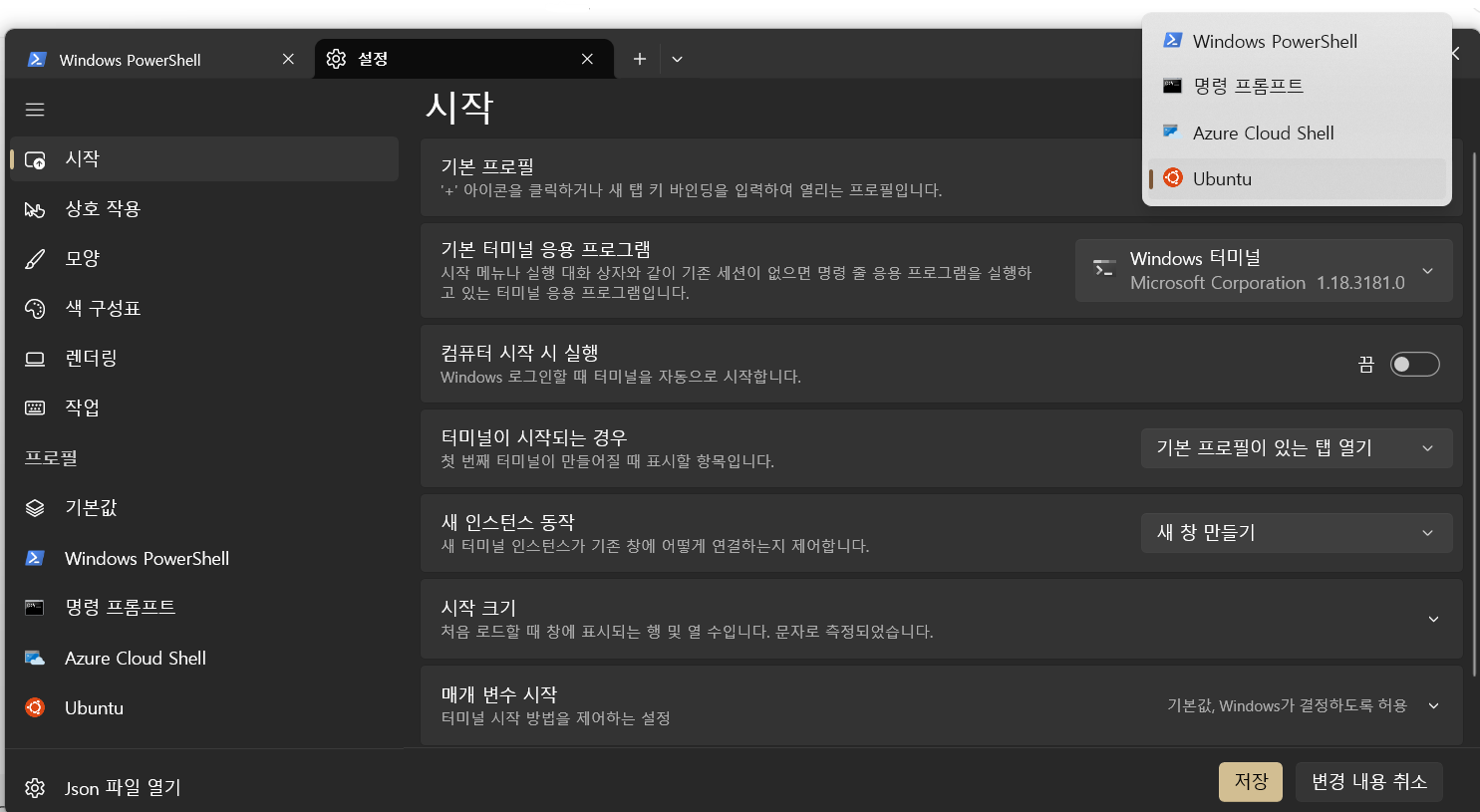 '기본 프로필'의 경우 터미널을 열었을 때 어떤 타입의 셸을 열지 설정할 수 있다. 예를 들어, WSL을 사용하기 위해 기본적으로 리눅스 우분투 터미널이 뜨길 원한다면 기본으로 설정된 'Windows PowerShell' 대신 'Ubuntu'를 클릭하여 기본 프로필로 설정할 수 있다.