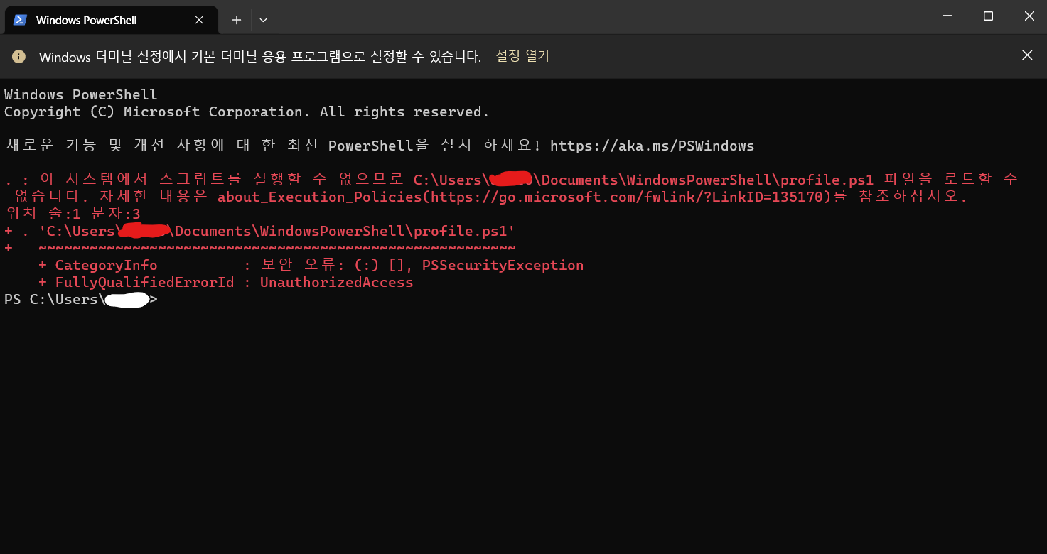 창에 빨간색으로 "이 시스템에서 스크립트를 실행할 수 없으므로 ~~ \profile.ps1 파일을 로드할 수 없습니다. 자세한 내용은 about_Execution_Policies(https://go.microsoft.com/fwlink/?LinkID=135170)를 참조하십시오." 라는 메세지를 볼 수 있는데, 이는 스크립트 실행 권한이 제한(Restricted)되어 있기 때문이다.