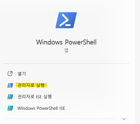 이를 해결하기 위해서는 Windows PowerShell을 관리자 권한으로 실행하여 스크립트 실행 권한을 변경해주어야 한다. 먼저 윈도우에서 PowerShell을 검색한 후 '관리자로 실행' 버튼을 눌러 실행한다.