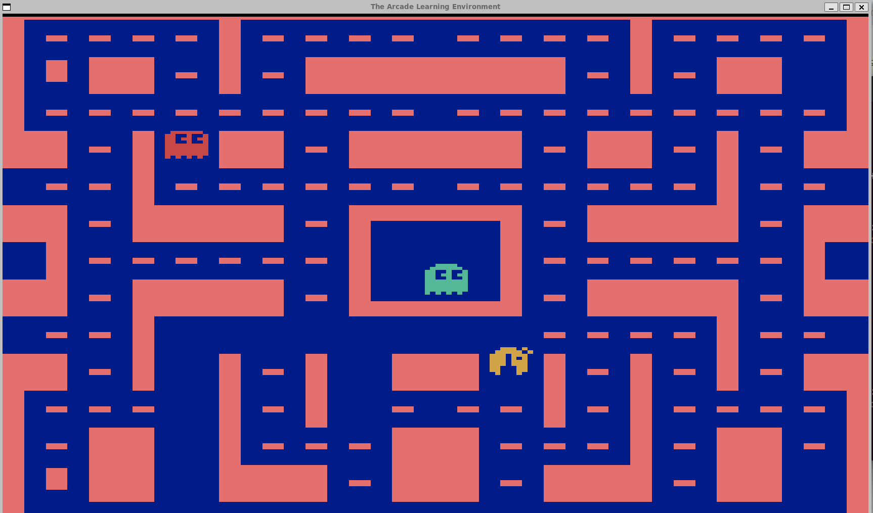 이제 터미널에서 작성한 파이썬 스크립트를 실행하면 아래 그림과 같은 팩맨 게임이 실행되고 있는 것을 볼 수 있다. (처음 시작까지 다소 시간이 걸릴 수 있다.)
