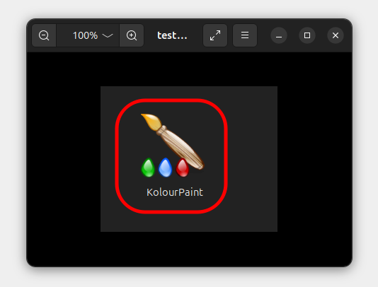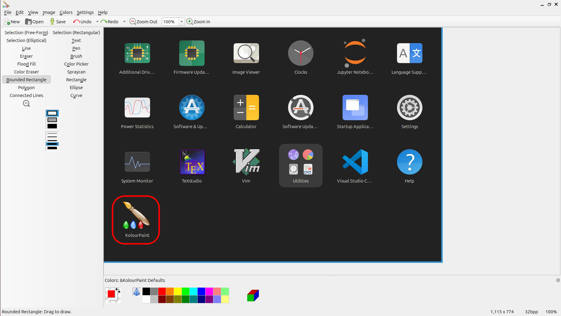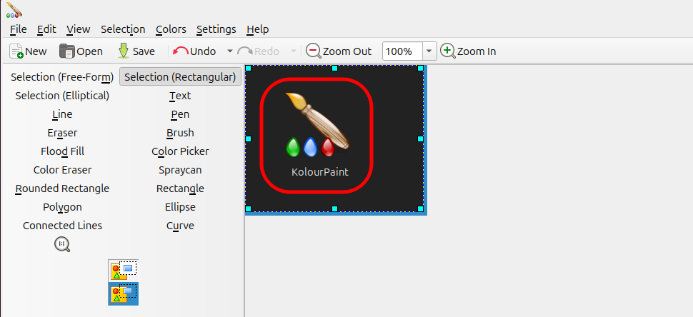 왼쪽 도구 목록에서 둥근 모서리 상자를 KolourPaint 아이콘 위에 그려보자. 여러 그림 도구들 중 Rounded Rectangle > 박스의 타입 > 선의 타입을 차례로 선택한 후 원하는 크기의 상자를 드래그하여 그린다.